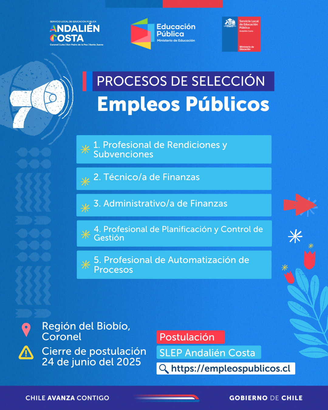 El Servicio Local de Educación Pública Andalién Costa informa la apertura de un nuevo proceso de selección de profesionales para desempeñarse en SLEP Andalién Costa en nuestro proceso de poblamiento, donde buscamos ampliar nuestros equipos de trabajo. Este nuevo concurso público cuenta de un total de 16 procesos de selección para cubrir 19 vacantes disponibles en nuestro […]