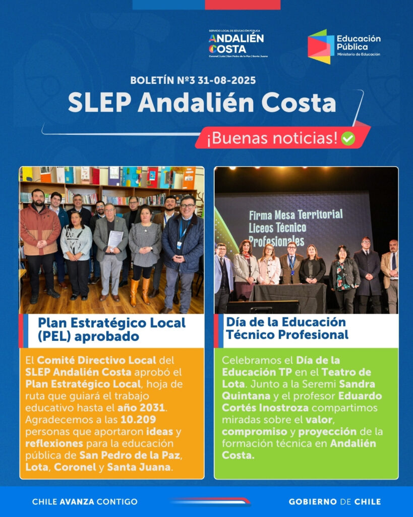 El Servicio Local de Educación Pública Andalién Costa pone a disposición de toda la comunidad educativa el Boletín Nº3, donde se resumen las principales noticias de este mes de agosto en los territorios de Coronel, Lota, San Pedro y Santa Juana.